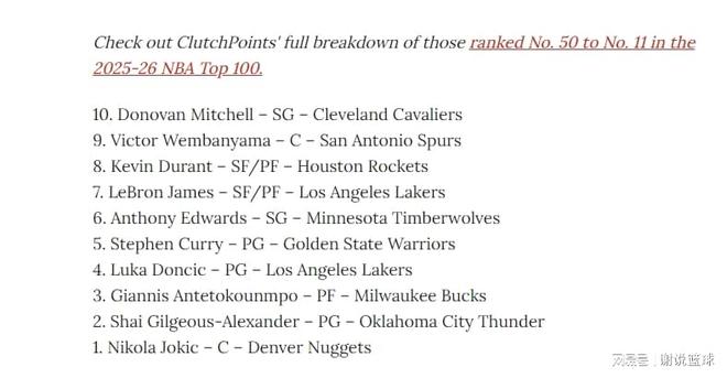 美媒评现役百大球星:约基奇领跑库里第五,詹姆斯杜兰特挤进前十